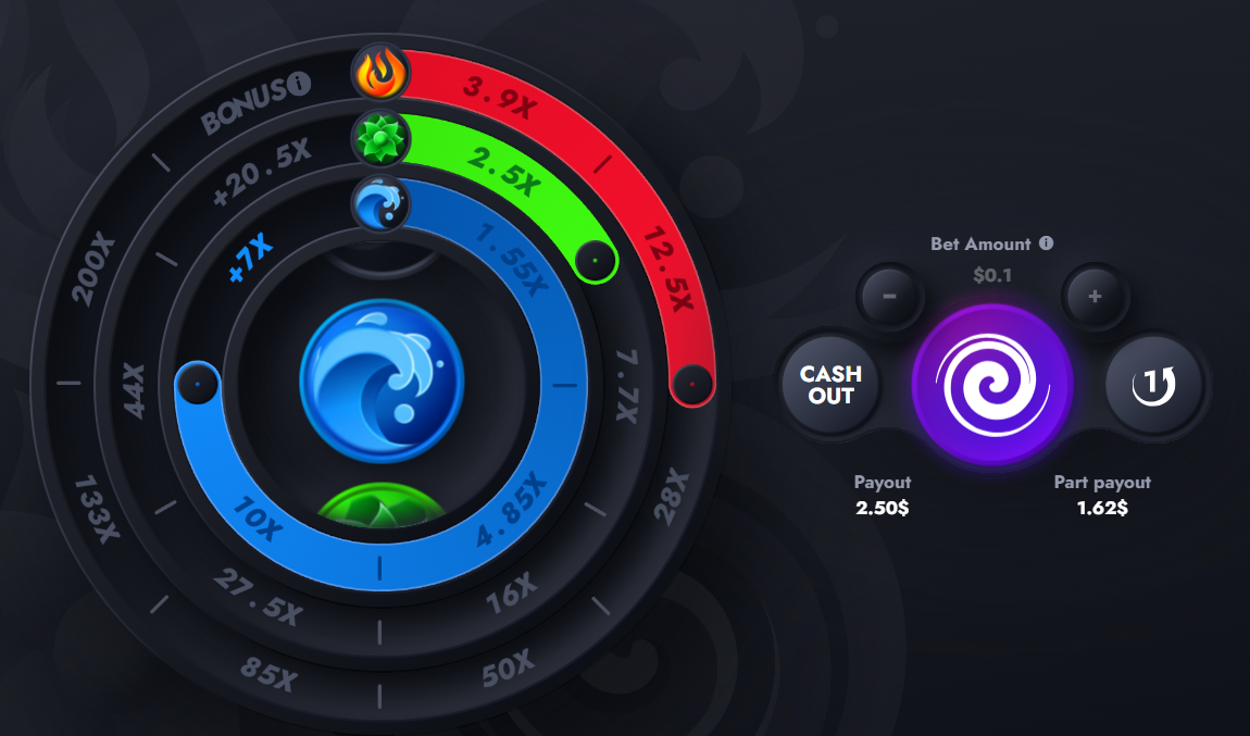 Players can choose between Cashout and Partial Cashout options. Cashout allows players to take the multiplier value and end the betting round. Partial Cashout can be enabled after one of the elements reaches the 2nd segment, moving the segment back one space while cashing out the multiplier gain from the most advanced segment. This option applies to all elements, and those that have only advanced to the first segment will be cashed out and start from the beginning. Players may choose to use Partial Cashout multiple times during a round.