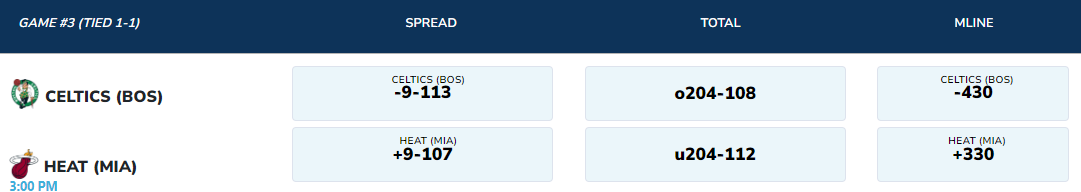 Rather than move the spread down in the above example to the game between the Celtics and the Heat, MyBookie decided to entice bettors with -107 odds to get bettors to balance out the betting on this line and back the Miami Heat.